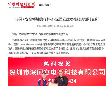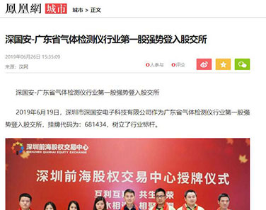2019年6月19日,深圳市深國安電子科技有限公司作為廣東省氣體檢測儀行業強勢登入股交所,掛牌前海股交碼為:681434,樹立了行業標桿。人民日報社、鳳凰網、中華網、中國財經時報網、騰訊網、新浪網、搜狐網、未來網財經、中國安防行業網、慧聰網、北國網、中國應急網、太平洋安防網等眾多媒體進行了報道。